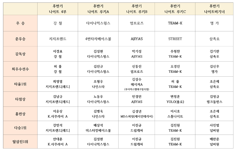 »ç¹«±¹ÀÔ´Ï´Ù. *Æ÷½ºÆ®½ÃÁð °æ±â¹æ½Ä - ¸®±×Á¾·áÈÄ P.OÀüÀ» Ä¡¸£°í ÃÖÁ¾°á½ÂÀüÀ» ÇÑ´Ù. - °á½ÂÀüÀº 2½Ã°£ ÀÌÈÄ¿¡´Â »õ·Î¿î À̴׿¡ µé¾î°¥ ¼ö ¾ø´Ù. - ÁØP.OÀü, P.OÀüÀº Äݵå°ÔÀÓÀ» Àû¿ë Çϸç 1½Ã°£ 50ºÐ ÀÌÈÄ¿¡´Â »õ·Î¿î À̴׿¡ µé¾î°¥ ¼ö ¾ø´Ù. - ÁØP.OÀü, P.OÀü, °á½ÂÀü½Ã µ¿Á¡½Ã¿¡´Â ¸®±×¼øÀ§°¡ ³ôÀºÆÀÀ» ½Â¸®ÆÀÀ¸·Î ÇÑ´Ù. - 7ÀÌ´×±îÁö µ¿Á¡½Ã¿¡´Â ¸®±×¼øÀ§°¡ ³ôÀºÆÀÀ» ½Â¸®ÆÀÀ¸·Î ÇÑ´Ù. (À§ »çÇ×Àº ±ÔÁ¤Å¸¼®°ú ±ÔÁ¤À̴׿¡´Â Àû¿ëµÇÁö ¾ÊÀ¸¸ç Ç÷¹ÀÌ¿ÀÇÁ ÃâÀü ±âÁØ¿¡¸¸ Àû¿ëµÊ) Ç÷¹ÀÌ¿ÀÇÁ ÃâÀüÆÀ °¨µ¶´Ô²²¼´Â ÇÊÈ÷ ÃâÀüÀÚ ¸í´Ü È®ÀÎ ÈÄ ÃâÀü ±âÁØ¿¡ ¹Ì´ÞµÈ ¼±¼ö³ª À߸ø ±âÀçµÈ ¼±¼ö°¡ ÀÖÀ¸¸é ¹Ýµå½Ã »ç¹«±¹À¸·Î ¿¬¶ô ¹Ù¶ø´Ï´Ù. (À߸ø ±âÀçµÇ¾î ¸í´Ü¿¡´Â ÀÖÀ¸³ª ¹Ì´ÞµÇ¸é ÃâÀüÀÌ ºÒ°¡ ÇÏ´Ï ¸í´Ü ÇÊÈ÷ È®ÀÎ ¹Ù¶ø´Ï´Ù.) *Ç÷¹ÀÌ¿ÀÇÁ°æ±â ´çÀÏ ½ÅºÐÁõ ÇÊÈ÷ ÁöÂü ¹Ù¶ø´Ï´Ù. (½ÅºÐÁõ ¹ÌÁöÂüÀÚ´Â °æ±â ÃâÀü ºÒ°¡) À¯´ÏÆû(»óÀÇ/ÇÏÀÇ/¸ðÀÚ) ¹Ýµå½Ã ÅëÀÏ ¹Ù¶ø´Ï´Ù -³ªÀÌÆ® 4ºÎ ¸®±×ÀÏ °æ¿ì Ç÷¹ÀÌ¿ÀÇÁ ÃâÀü ¼±¼ö ±âÁØÀº 4°æ±â 8Ÿ¼® or 8ÀÌ´×ÀÔ´Ï´Ù. -³ªÀÌÆ® ·çŰA ¸®±×ÀÏ °æ¿ì Ç÷¹ÀÌ¿ÀÇÁ ÃâÀü ¼±¼ö ±âÁØÀº 3°æ±â 6Ÿ¼® or 6ÀÌ´×ÀÔ´Ï´Ù. -³ªÀÌÆ® ·çŰB ¸®±×ÀÏ °æ¿ì Ç÷¹ÀÌ¿ÀÇÁ ÃâÀü ¼±¼ö ±âÁØÀº 5°æ±â 10Ÿ¼® or 10ÀÌ´×ÀÔ´Ï´Ù. -³ªÀÌÆ® ·çŰC ¸®±×ÀÏ °æ¿ì Ç÷¹ÀÌ¿ÀÇÁ ÃâÀü ¼±¼ö ±âÁØÀº 4°æ±â 8Ÿ¼® or 8ÀÌ´×ÀÔ´Ï´Ù. -³ªÀÌÆ® ºñ±â³Ê ¸®±×ÀÏ °æ¿ì Ç÷¹ÀÌ¿ÀÇÁ ÃâÀü ¼±¼ö ±âÁØÀº 4°æ±â 8Ÿ¼® or 8ÀÌ´×ÀÔ´Ï´Ù. (°¢ ÆÀ °¨µ¶´ÔÀº ÀÚµ¿ ÃâÀüÀÔ´Ï´Ù.) *¸ô¼ö °æ±â ½Ã ¸ô¼ö ½Â¸®ÆÀÀº +1°æ±â ŸÀÚ 3Ÿ¼® / Åõ¼ö¿¡°Ô 4ÀÌ´×À» ÀÎÁ¤Çϸç, ¸ô¼öÆÐ ÆÀ¿¡°Ô´Â Ÿ¼®°ú ÀÌ´×À» ÀÎÁ¤ÇÏÁö ¾Ê½À´Ï´Ù. *[°¢ ¼øÀ§ °áÁ¤¿¡ °üÇÑ ¼¼ºÎ »çÇ×] -°¢ Á¶ÀÇ ÆÀ¼øÀ§´Â ´ëȸ ±ÔÁ¤¿¡ ÀÇÇØ ½Â·ü·Î °è»êÇØ ¼øÀ§¸¦ °áÁ¤ÇÑ´Ù -½ÂÀÚ½ÂÀ» °¡¸± ¶© ÇØ´çÆÀ°£ÀÇ °æ±â°¡ ¹«½ÂºÎ¿´´Ù¸é ¸ðµç ÆÀ°£ÀÇ ÃѽÇÁ¡ÀÌ ÀûÀºÆÀÀ» »óÀ§ÆÀÀ¸·Î ÇÑ´Ù. -ÃѽÇÁ¡ ¶ÇÇÑ °°´Ù¸é ÃѵæÁ¡ÀÌ ¸¹Àº ÆÀÀ» »óÀ§ÆÀÀ¸·Î ÇÑ´Ù.( ½Â·ü-½ÂÀÚ½Â-ÃÖ¼Ò½ÇÁ¡-ÃѵæÁ¡ ) -ÃѵæÁ¡ ¶ÇÇÑ °°´Ù¸é Ãß÷À¸·Î »óÀ§ÆÀÀ» °áÁ¤ÇÑ´Ù. ( ½Â·ü-½ÂÀÚ½Â-ÃÖ¼Ò½ÇÁ¡-ÃѵæÁ¡ ) << ÈĹݱ⠳ªÀÌÆ®¸®±× Ç÷¹ÀÌ¿ÀÇÁ ÆÀ ¼øÀ§ ¹× ÃâÀü¼±¼ö ¸í´Ü >> -4ºÎ ¸®±× ( 4°æ±â / 8Ÿ¼® or 8ÀÌ´× ) 1À§ – ° ö [°¨µ¶:À̰æÇ¥] (14¸í) ±¸µ¿ÈÖ, ¹ÚÅ¿µ. ¹ÚÁöÈÆ. ¿¹È¿½Â, À̵¿±Ô, À¯ÇöÀç, Á¤½Â¿µ, Çã ·ü, ¼»óÇö, ÀÌÇõÁø, ÀüÁß·Ï, ±¸½Â¸ð, Á¤Áؼ· 2À§ – ÁöÁöÇÁ·»µå [°¨µ¶:ÃÖ¿µ¿] (13¸í) ÀÓÇöö, ±è³²±Ô, Á¶¾ç¼ö, ÀåÈ£¿¬, ¾çÈñ¿ì, ±è¿µ±Ô, ÀüÇüÁØ, À±½ÂÈÆ, ±èÁ¤È£, ±è»ó·Â, ±è°æ¹è, °¹Î¼® 3À§ – ANGELS[½º¸¶Æ®Ä¡°úÁ×ÀüÁ¡] [°¨µ¶:À̺´Èñ] (14¸í) ±è»óÀ±, ÀÌ»ó¸ñ, ¼Àμ®, ±èÇö¿ì, ¼ÁöÈÆ, ¹Ú±ÔÅÂ, Àº±â¿ì, Àü¹ÎÁ¦, ÀÌÁ¤Çö, ±èº´¿í, ¾È´ëÇõ, ±è»ó¼ö, °Çöºó -------------------------------------------------------------- -·çŰA ¸®±× ( 3°æ±â / 6Ÿ¼® or 6ÀÌ´× ) 1À§ – ´ÙÀ̳ª¹Í½ºÀ®½º [°¨µ¶:±è¼ºÇö] (13¸í) ¹®¼º±Ô, ³ëµ¿¿ì, ±èÁرÔ, ±èµ¿Çö, ±Ç¿µÇö, ±è¸í¼±, À̰æ¿, ÀÌ»ó·Ä, ¼ºÁØÈ£, Ȳ¾È¼ö, ±èº´Á¶, ¹Ú»óÈÆ 2À§ – 4¹øÅ¸ÀÚº£À̽ºº¼A [°¨µ¶:ÃÖ¿µ¿] (14¸í) ÀÓÇöö, ¼ÕâÈñ, ä¼ö¹Î, ±è³²±Ô, Á¤ÀçÁø, ½Å¿ì½Ä, È«¼®¸¸, ¼ÛÀç±Ù, ±èÁ¤È£, À±Áß±æ, Áø¿ëÁØ, ¹ÚÀç¹Î, À̵¿ÀÎ 3À§ – ³ªÀνºÅ¸ [°¨µ¶:Àå°æÈ£] (13¸í) Á¶Çü¿ì, Á¶Çüö, Á¤°Ç¿ì, ±èµ¿Çö, ÃÖº´µÎ, Àü¹ÎÁ¦, ±èÁØÈ£, ¾È´ë±æ, ±èº´¿í, ÃÖ¹®±Ô, ÃÖµ¿°ü, ±è·¡Çü 4À§ – ¹Ì½ºÅͱøº£À̽ºº¼ [°¨µ¶:Á¤¼®À±] (12¸í) ³²Á¦¼®, ¹Î°æ¹Î, ÀÌÁ¦È¯, ÀÓ¿µÁÖ, ±èµµ¿î, ÁøÁöÈÆ, ±èâÈñ, ¹è°ÇÁÖ, ±è¼º±Ù, ÁøÃ»È¯, ¹è»ó¼® -------------------------------------------------------------- -·çŰB ¸®±× ( 5°æ±â / 10Ÿ¼® or 10ÀÌ´× ) 1À§ – AJIYAS [°¨µ¶:¹Ú±â¼º] (14¸í) ¹Î°æ¹Î, ¹ÚÁöÇõ, ¿°°æ¹Î, ³²ºÎ½Ä, ±Ç¼øÇö, ±èâ¼ö, ±Ç¼¼¹Î, ±èºÎ¿ë, À̼º¹Î, ±èÀç¿ø, À̽¿ì, ·ùÁöÇö, ±è¹Î½Â 2À§ – ¾öºê·ÎÁî [°¨µ¶:Á¶ÀºÁ¦] (11¸í) ½ÅÇö±â, ±èµµÈÆ, ¼Û¼®±Ù, ÇÑö¹Î, Á¤½Â¿µ, ½Åµ¿Áø, ¿©Çö¼®, ±èµµÇü, ±èµ¿Áø, ¼ÁöÈÆ, 3À§ – ±ÝºûÀÚ¿ø [°¨µ¶:±èÁ¤ÈÆ] (11¸í) È«¼®±â, ±è¼º¹è, ³ªÀÎÈ¿, ½Éâ¼·, ÃÖ»óÇö, ÀÌÅÃÁ¤, ±è´ëÈÆ, Á¤¿ìÀç, ¿°¼¼ÈÆ, Àå¹Î¼®, 4À§ – ¸ÞÀÌÀúA [°¨µ¶:Á¤¼ºÇÐ] (14¸í) ±è»ó¼ö, ¾ö½Ã¿, Ãֿ쿬, ¹ÚÀç½Ä, ÃÖµ¿°ü, À̺´Èñ, ÀÌ»óö, ÀÌÈñ±Ù, ¹Úµ¿°Ç, Àº±â¿ì, ½Å¿Ï¿ë, À̱¤ÀÍ, À̺´È£ -------------------------------------------------------------- -·çŰC ¸®±× ( 4°æ±â / 8Ÿ¼® or 8ÀÌ´× ) 1À§ – TEAM-K